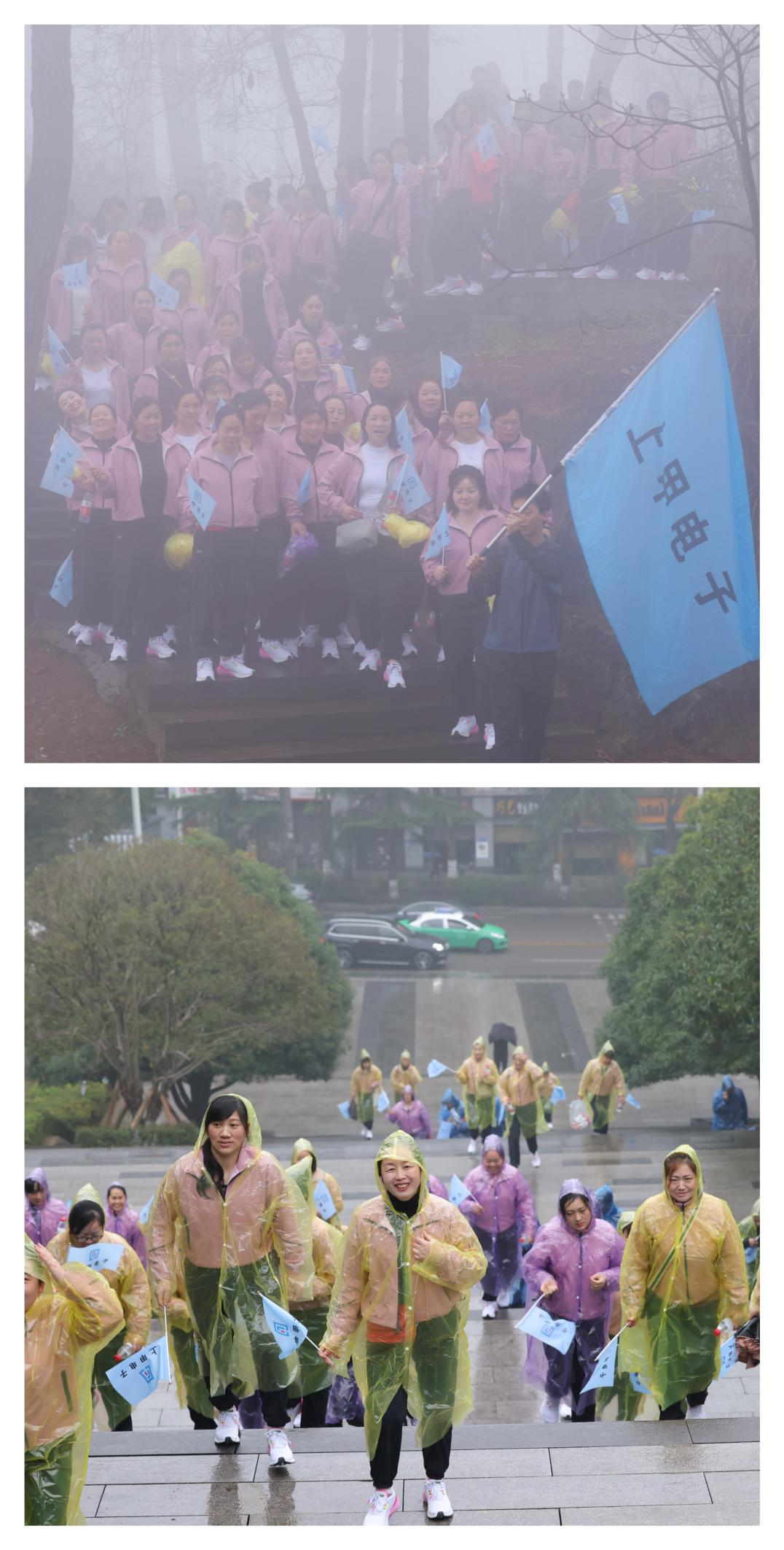 上午8:40分,初春的白鶴公園,淺霧中夾雜著淅淅瀝瀝的春雨,清晨雖頗有涼意,但也無(wú)法阻擋上甲巾幗登山的熱情。隨著一聲“出發(fā)”,大家手拿廠旗,身著統(tǒng)一服裝,披上五彩斑斕的雨衣,精神抖擻地向著白鶴山頂踏步前進(jìn)。